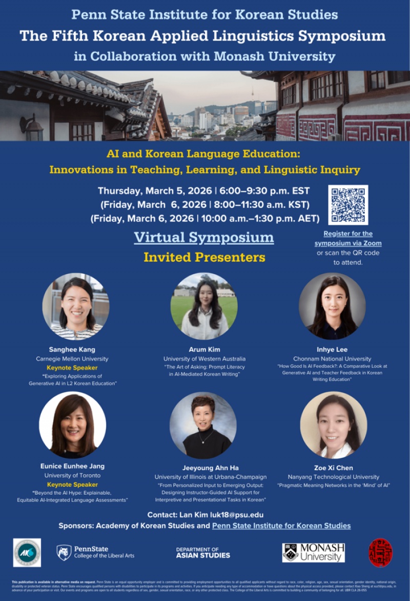 이번에 PSU와 Monash University가 협력하여 “AI and Korean Language Education: Innovations in Teaching, Learning, and Linguistic Inquiry”라는 주제로 3월 5일(오후 6시–9시 30분) 심포지엄을 개최하게 되었습니다.