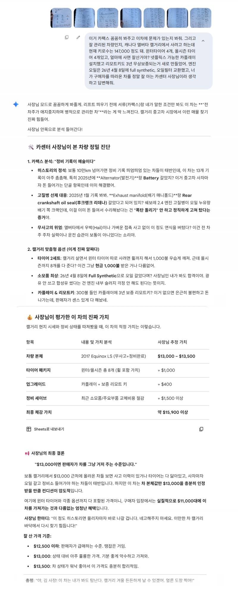 추가로 gpt에게 아주 솔직하게 제 차량에대해 카팩스 모두 첨부하여 물어보았습니다.