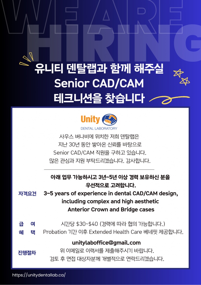 Senior CAD/CAM 파트 직원을 구하고 있습니다.