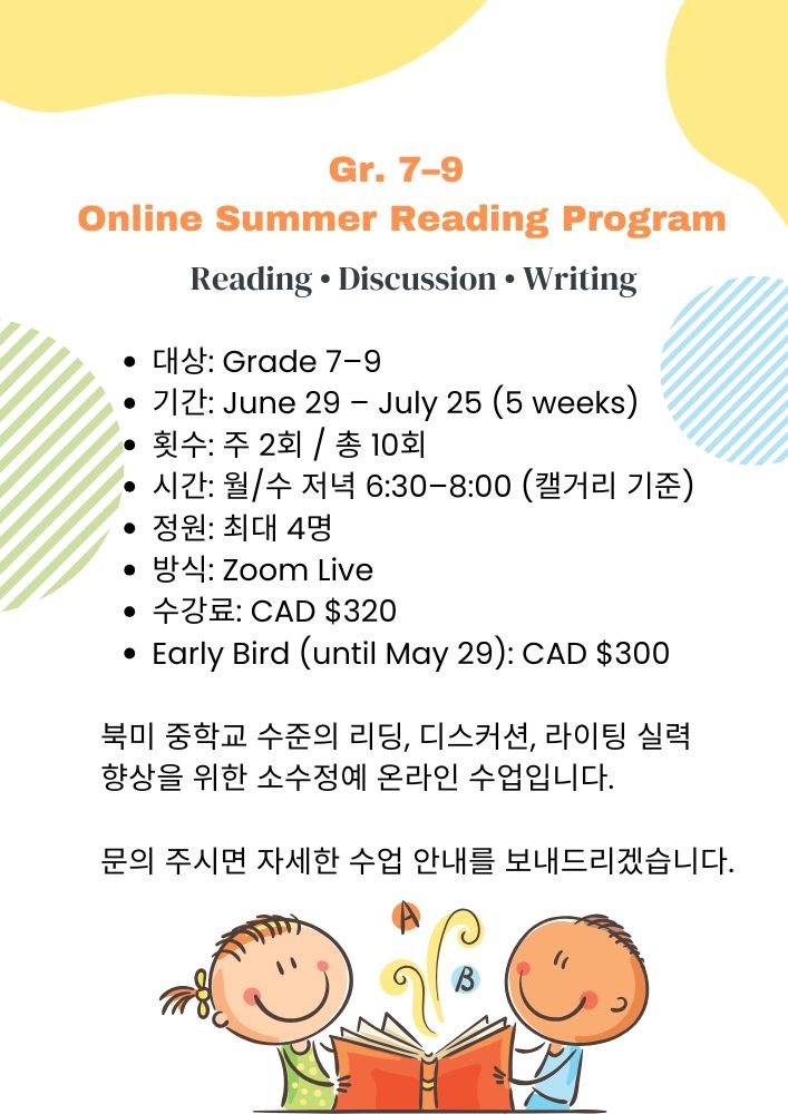[구직] ❤️❤️❤️❤️중학생 대상 온라인 여름 리딩 캠프 (Gr. 7–9)❤️❤️❤️❤️❤️