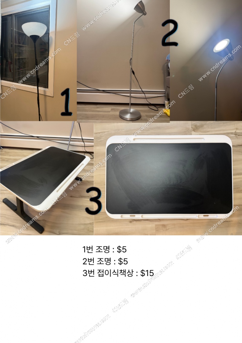 1. 조명 2개 : 각 5불 / 사용감 많아요. 2번 조명은 헤드 고정이 잘 안되지만 위로 젖혀서 밝히는데는 문제 없었습니다.