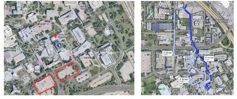 주차: 캘거리대학교 내 주차장 Lot 1  (Hourly rate: $5/hr, Daily max: $22.50), Art Parkade (Flat rate: $12); Free parking: Capitol Hill Crescent (University 기차역, 대학 반대편) 또는 Brentwood 기차역 주변 (20분 도보), 첨부 지도 참조