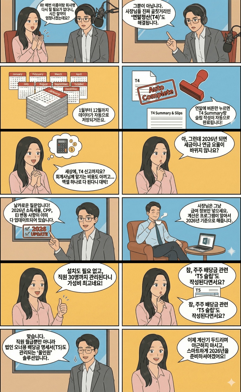 이 프로그램의 가장 큰 장점은 데이터가 누적된다는 것입니다. 1년 동안 입력한 급여 자료가 차곡차곡 쌓여, 연말에는 버튼 하나만 누르면 직원별 T4 Slip과 CRA 신고용 T4 Summary가 완성됩니다. 한편, 법인 사업자를 위한 주주 배당금(T5) 관리 기능도 포함되어 있습니다.