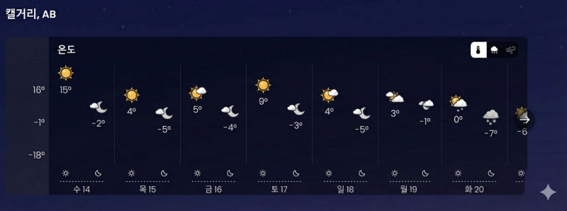 캘거리 오는 일주일 일기예보입니다. (일기예보가 좀 변할때도 있죠. 자연이 하는 일이니까요)