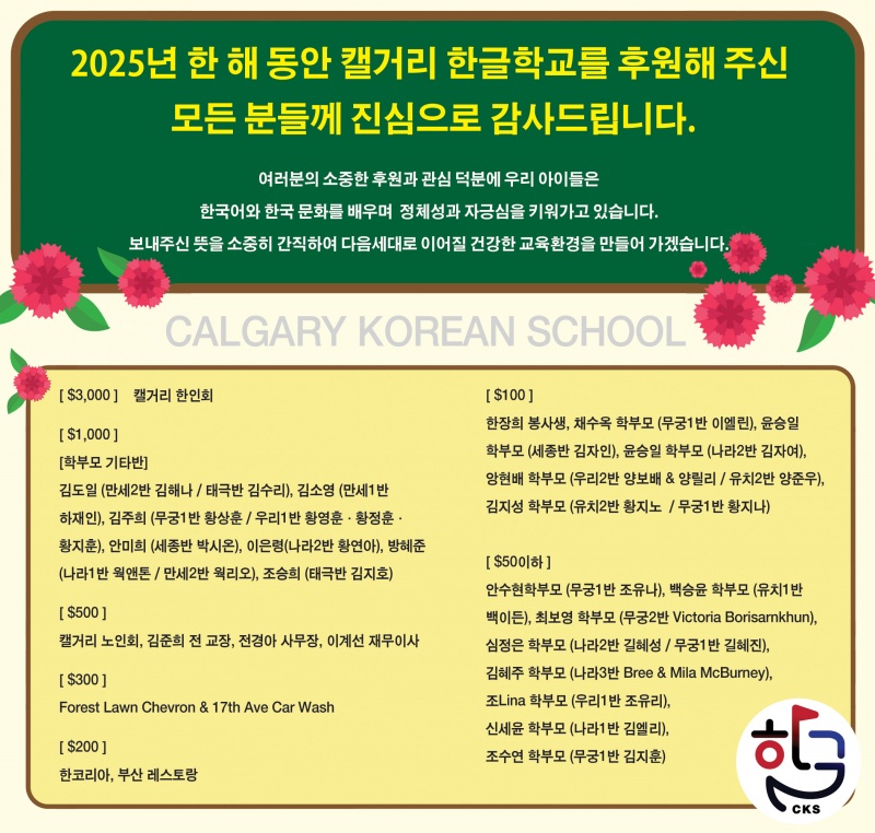 캘거리 한글학교에 후원해 주신 분들께 감사드립니다