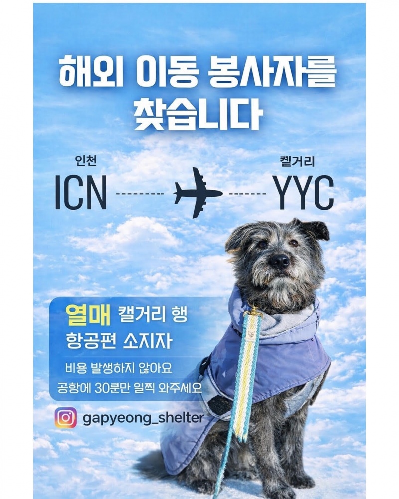 캘거리로 입양이 결정된 애견의 비행기 탑승(인천-캘거리)을 도와주실 천사를 찾습니다.