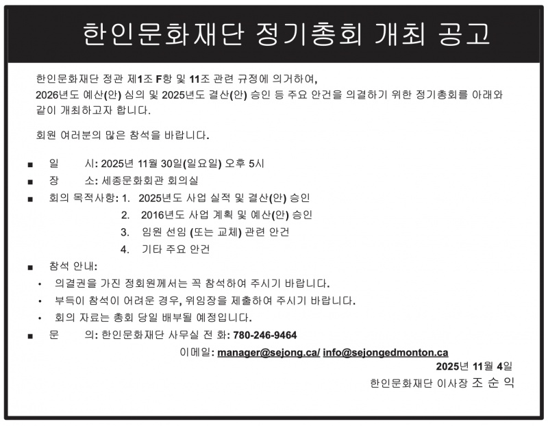 에드먼튼 한인문화재단 정기총회 개최 안내..11월 30일(일) 오후 5시