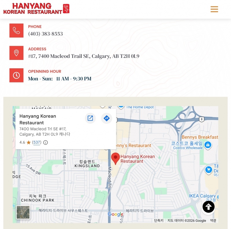 업종(혹은 상호) : 한양(Hanyang korean restaurant)