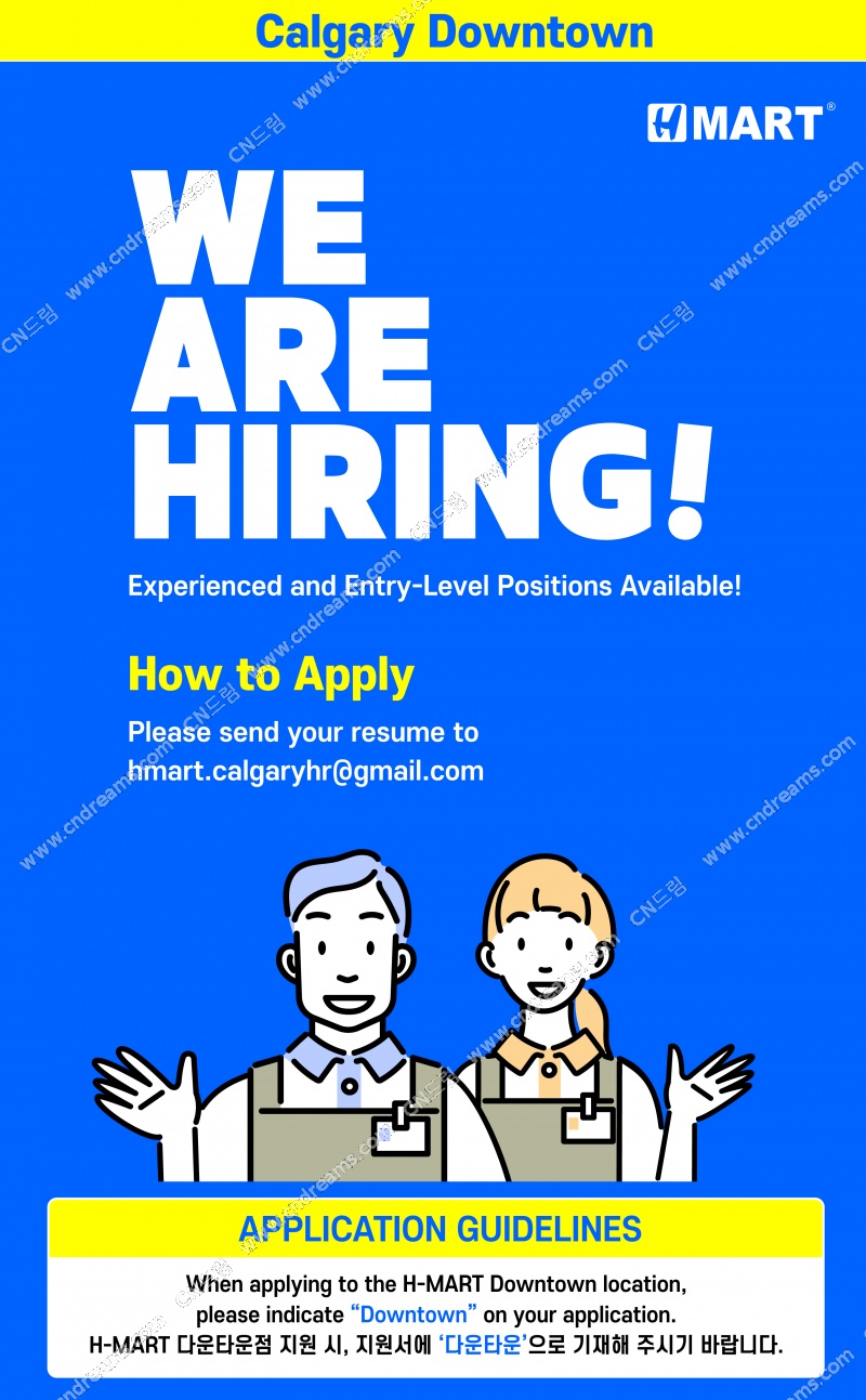 * hmart.calgaryhr@gmail.com으로 이력서 및 간단한 자기소개 첨부해 주세요.
