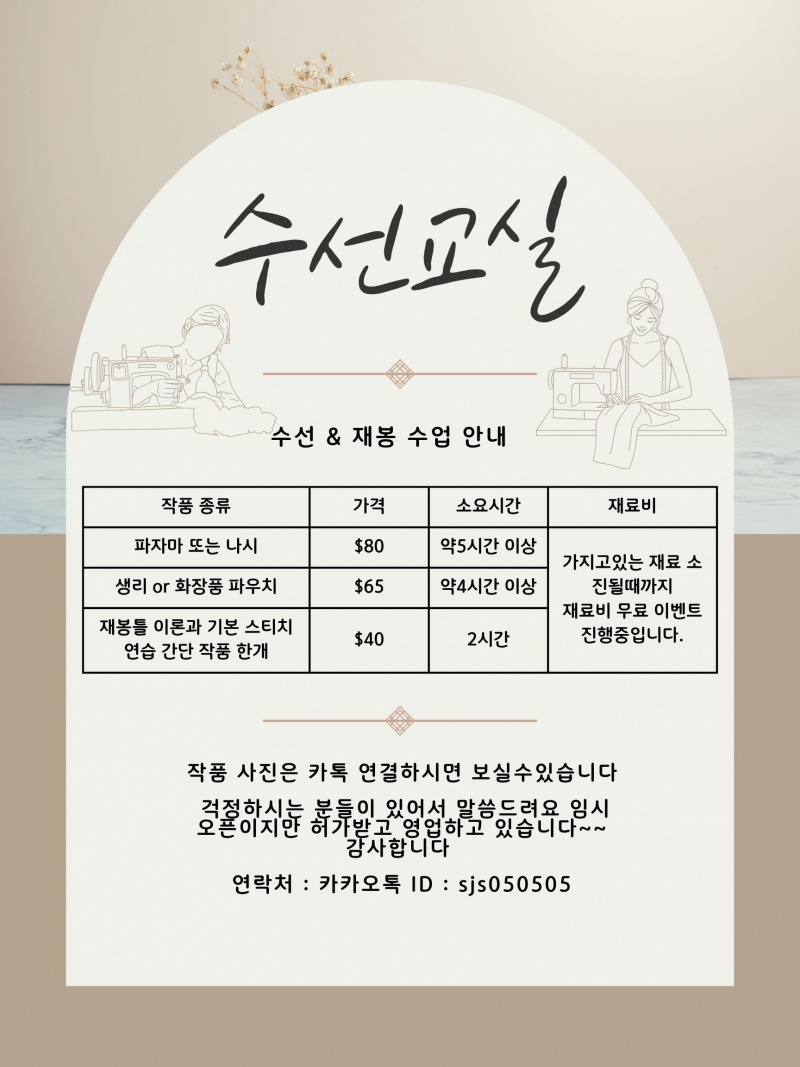 의류 수선과 수선 교실을 함께 운영하고 있으며, 에드먼튼 시청 비즈니스 라이센스를 발급받아 정식 운영 중입니다 현재 시범 운영 기간으로, 추후 가격이 조정될 수 있습니다