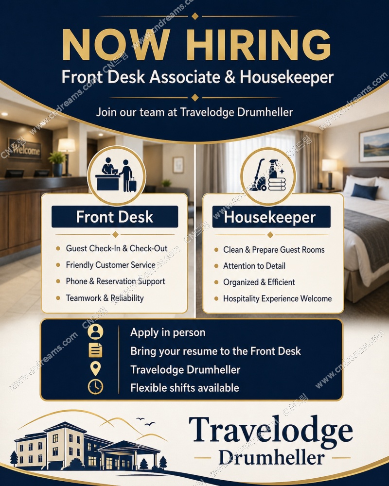 알버타 Drumheller Travelodge 호텔 에서 함께 일하실 분 모집합니다!