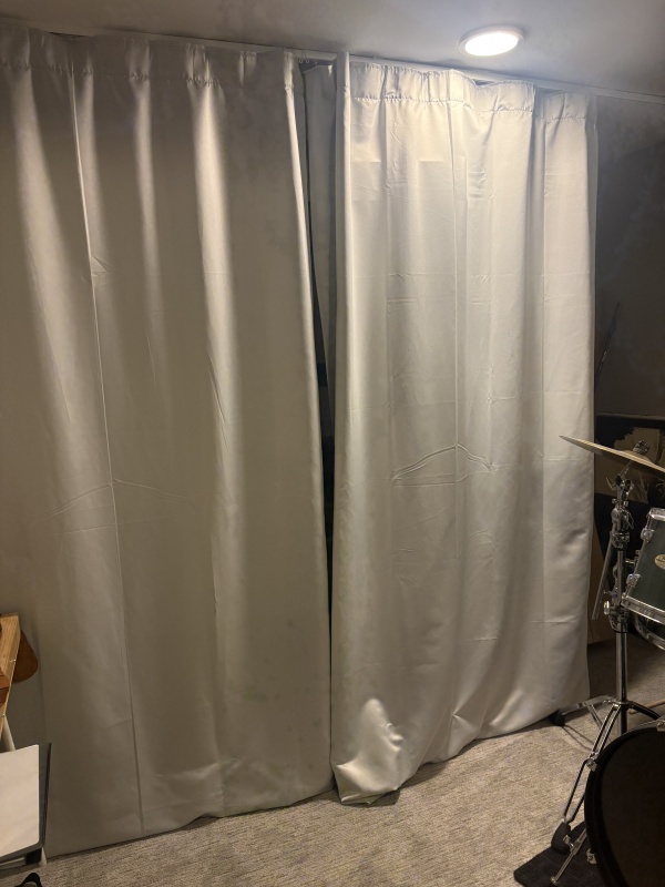 햇빛 차단 커튼 2개와 레일 2개. 판매금액은 30불(150불정도 구매)입니다. 공간 구분용으로 사용해서 빛바램이나 사용감이 거의 없습니다. 바닥은 길이가 길어 접어있습니다