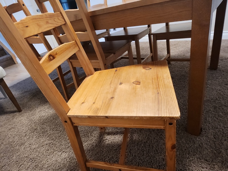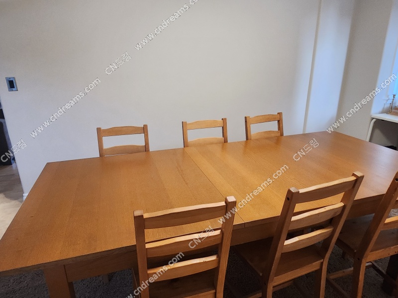 식탁은 95cm x 1.8m 로 4인용이나 확장테이블 2개 연결하면 6인용(2.2m), 8~10인용(2.6m)까지 가능합니다. 의자는 IKEA 로 6개 포함입니다.