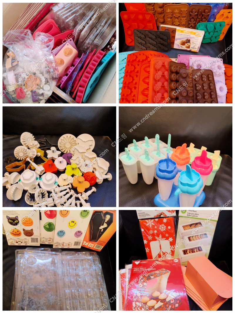 Downsizing sale. Most items are brand new, never used. Includes: * Various kinds of Candy/chocolate Silicone molds 20+ *Various kinds of Candy/chocolate Plastic molds 16+ *Assorted Cookie cutters/ plunger cutters 40+ *Treat boxes 20 + *Popsicle molds 3kinds Selling all together for only $45 !!