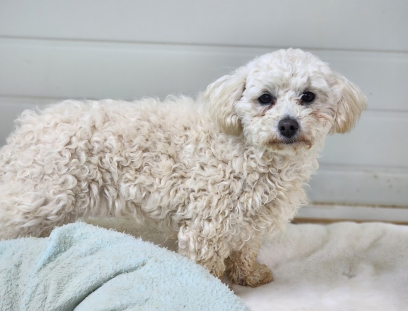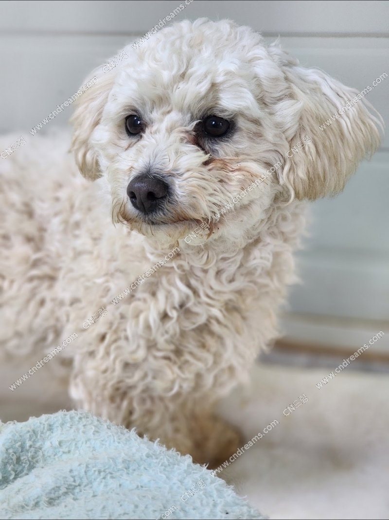 지난 여름, 열악한 번식장에서 구조된 아이로 한 번도 사랑을 받아본 적 없는 아이입니다.