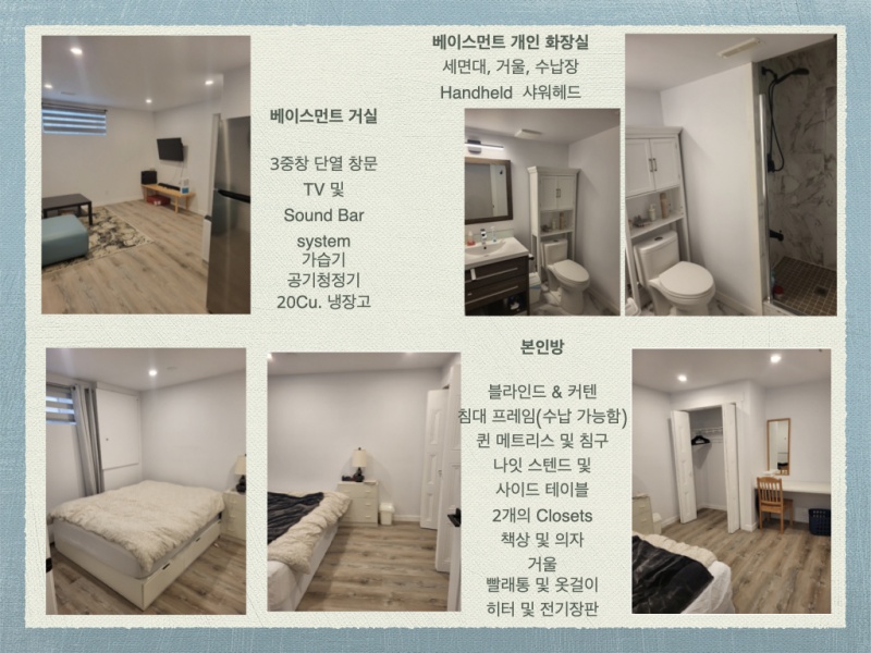 베이스먼트: 개인 3pc bath(Sink, Toilet, Shower), 퀸 침대&프레임, 책상, 의자, 서랍장, 클로젯