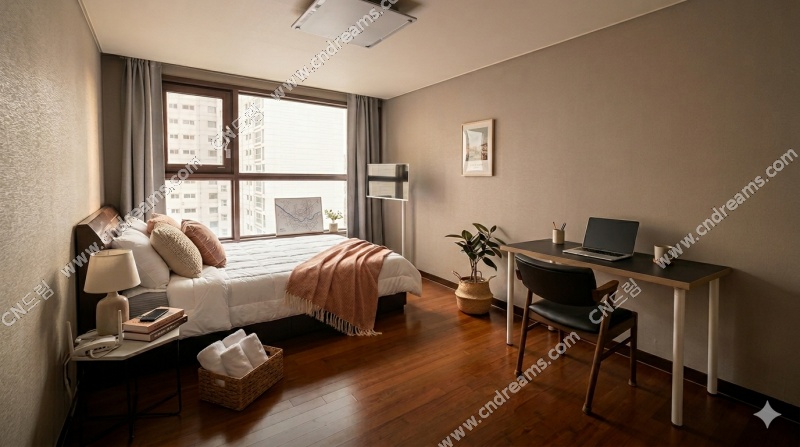 침구: 퀸(Q) 사이즈 침대, 호텔식 침구 특징: 32인치 삼성 스탠바이미 설치, 넓은 수납공간,업무용 책상 - 화장실은 호스트와 분리된 고객만의 화장실 이용