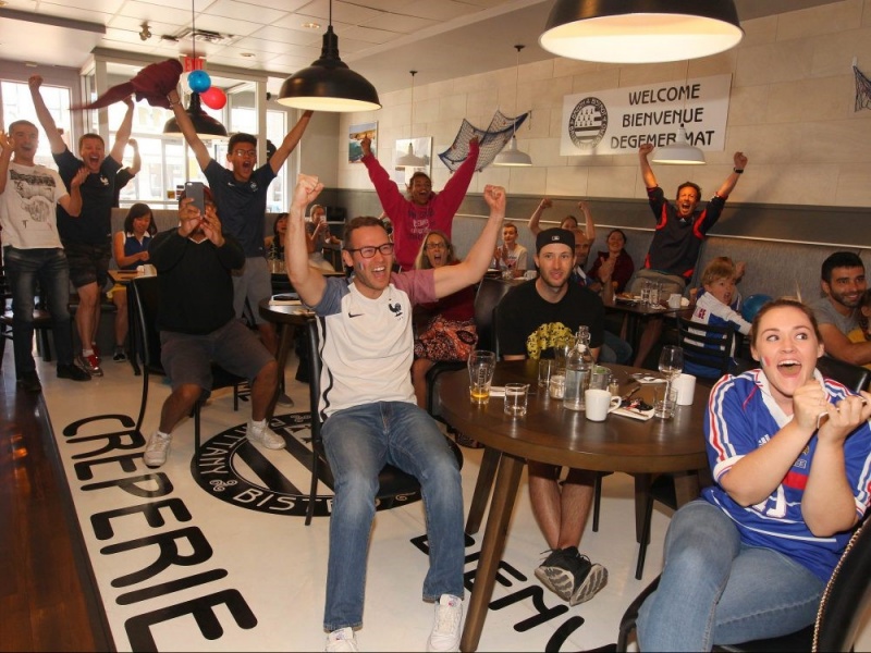캘거리에 거주하는 프랑스 축구 팬들은 캘거리의 한 레스토랑에 보여, 프랑스가 2018 월드컵의 우승컵을 들어 올리는 모습을 함께 지켜보고 응원했다. 프랑스 국기를 얼굴에 그리고 축구 유니폼을 착용한 채 17 Ave Breizh Bistrot에 모인 프랑스 팬들..