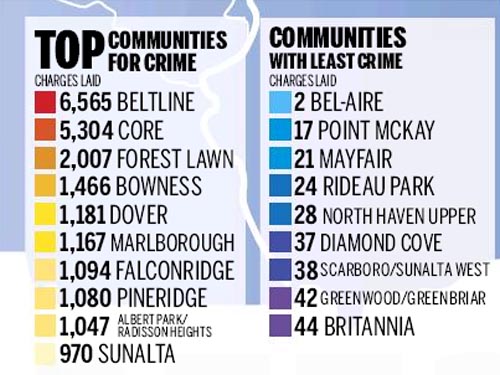 2014년 캘거리 범죄 통계가 발표되었다. 예상대로 다운타운과 벨트라인 지역이 최다 범죄발생지역으로 나타났으며 다음으로는 시 동쪽 지역이 뒤를 이었다. 동쪽 지역 중에서 가장 범죄발생률이 높은 곳은 포레스트 론, 도버, 말보로, 팔콘 리지로 나타났으..