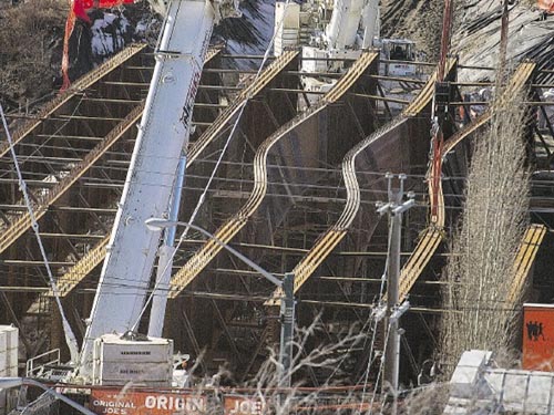 에드몬톤 북부 세인트앨버트로 연결, 출퇴근 시간 차량으로 혼잡 정체구간을 형성하는 그로트로드(Groat Road)의 상공을 가로지르는 102Ave를 잇는 다리 공사에 사용되는 4개의 대형 철강보(steel birders)가 엿가락처럼 휘어진 상태로 발견되어 관련 기술..