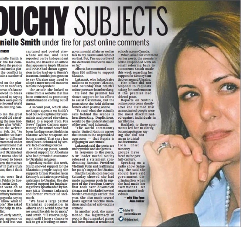 우크라이나에 대한 주 수상의 과거 온라인 게시물이 뜨거운 감자가 되어 돌아와 주 수상을 난처하게 만들고 있다.다니엘 스미스 주 수상은 과거 우크라이나 전쟁과 관련된 우파 소셜 미디어 플랫폼에서 다른 여러 주제와 함께 한 발언으로 비난을 받고 있다.주..