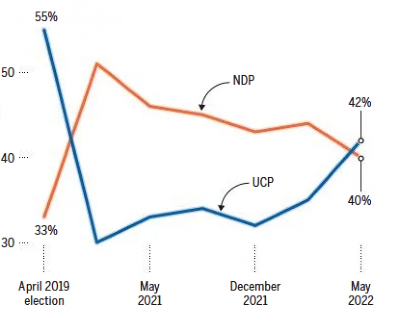 UCP의 지지율이 급반등했다. 케니 사퇴 선언이 발표되자마자 곤두박칠쳤던 지지율이 NDP를 앞서기 시작했다. 레저 사가 실시한 가장 최근의 여론조사 결과 지금 총선이 이러질 경우 지지 정당을 결정한 유권자들 중 42%가 UCP에 표를 던지겠다고 응답..