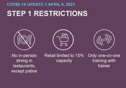 알버타 주는 보건 시스템을 보호하고 주 전역의 코비드-19 상승 확산을 줄이기 위해 4단계 프레임 워크의 1단계로 돌아갑니다.4월 6일 오후 11시 59분부터 소매, 피트니스 및 공연 활동에 업데이트된 필수 보건 조치가 적용됩니다. 4월 9일 금요일..