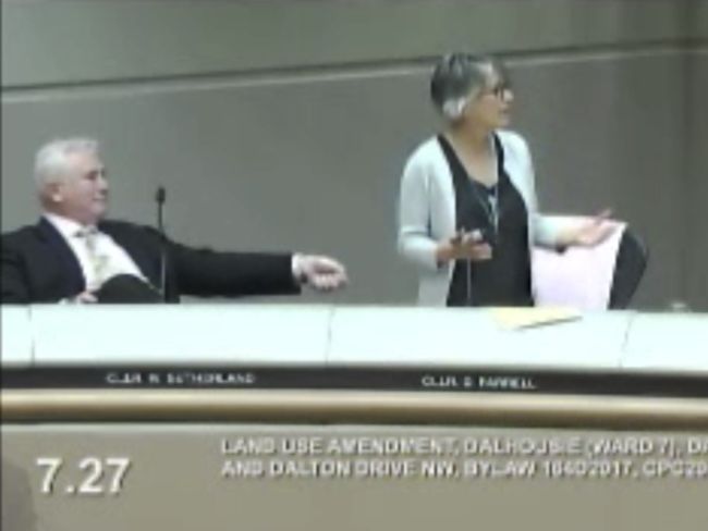 캘거리 청렴 위원장 알렌 술래틱키가 시의원 와드 서덜랜드가 지난 5월 8일 진행된 시의회 중 옆자리 동료 의원인 드류 파렐의 등 뒤에서 칼을 찌르는 시늉을 한 행동이 시의원으로써의 윤리 강령을 어긴 것은 아니라고 발표했다. 술래틱키는 성명서를 통해 ..