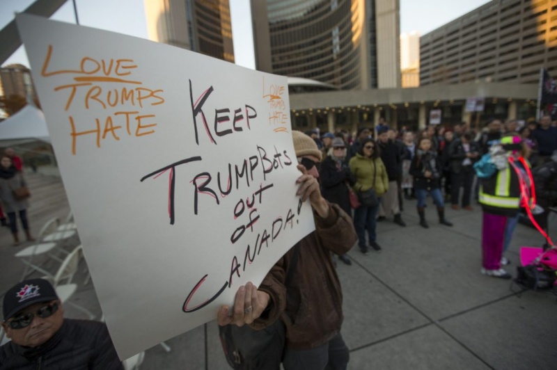 예상과 달리 나온 미 대선 결과에 당황한 토론토 시민들이 모여 반 트럼프 시위를 벌였다. 일요일 저녁 내던 필립 광장에 모인 200여명의 시민들은 “우리가 여기 모여 메시지를 보내는 것은 미움(트럼프를 나타내는 단어)은 옳지 않고 평화를 메시지를 보..