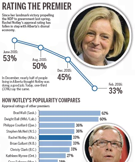 노틀리 주수상의 지지도 하락 추세가 심상치 않다. 지난 해 5월 총선 승리 당시 53%대를 유지하던 지지도가 올 해 2월 현재 33%까지 추락하면서 향후 NDP의 정책 추진, 특히, 경제 정책에 대한 상당한 부담을 안게 될 것으로 보인다. Angus R..