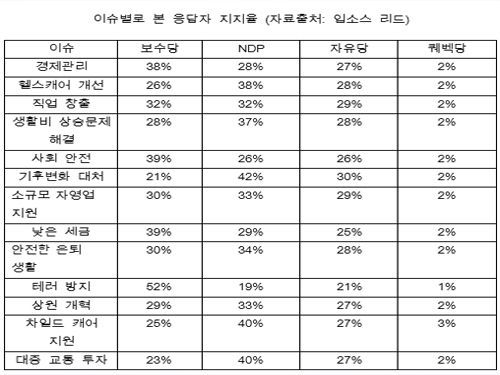 여론조사기관 입소스 리드가 최근 조사한 바에 따르면 이번 연방 총선의 최대 이슈는 경제, 직업창출, 헬스캐어인 것으로 결과가 나왔다. 이번 조사에서 응답자들의 78%가 경제관리를 가장 중요한 이슈라고 대답했고 73%가 헬스캐어 문제점 개선, 73%가..