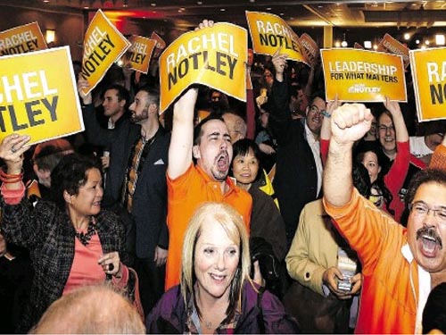 에드몬톤의 19개 의석을 전부 휩쓸며 앨버타 주도를 뒤덮은 거대한 오렌지 물결 속에 역사적 기념비가 세워졌으며, NDP 리더 레이첼 노틀리에게는 탄탄한 지지기반이 마련되었다. 보수당의 14개, 자유당 2개, 그리고 주변 6개 의석 모두 NDP수중으로..