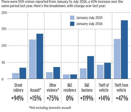 올 해 상반기 캘거리 다운타운의 범죄 증가율이 심상치 않다. 지난 주 발표된 자료에 따르면 올 해 7월까지 다운타운의 범죄율은 지난 해 동기 대비 41%나 증가해 시민들의 안전을 크게 위협하고 있다. 범죄 유형별로는 재산 침해, 강도, 차량 물품 절..