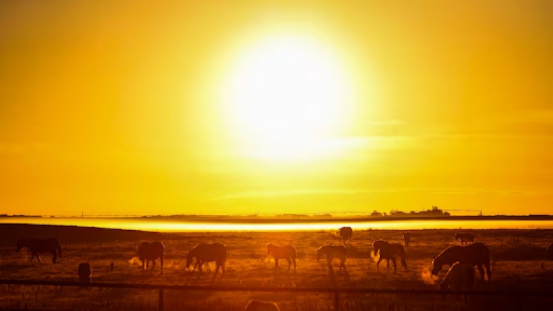 앨버타주 포트 맥클라우드 인근 안개 낀 풍경 위로 해가 떠오르는 가운데 말들이 들판에서 풀을 뜯고 있다. (사진출처=The Canadian Press)