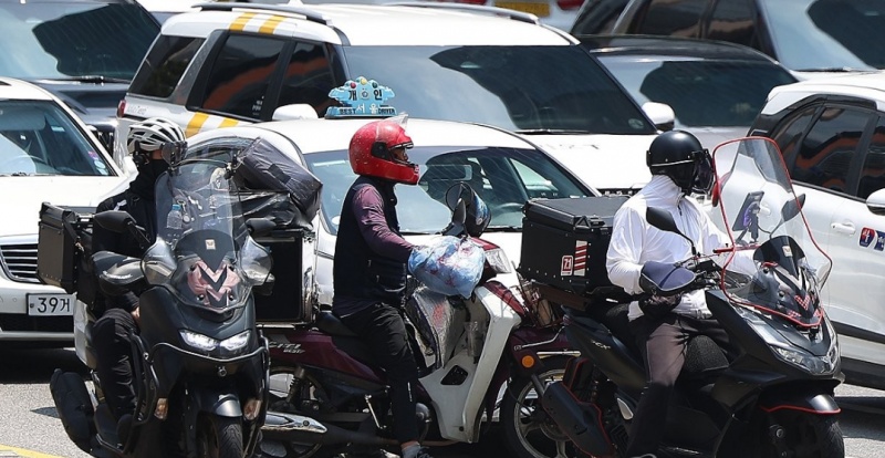 서울 강남역 사거리에서 배달라이더들이 교통신호를 기다리고 있다. (사진 출처 : 연합뉴스)