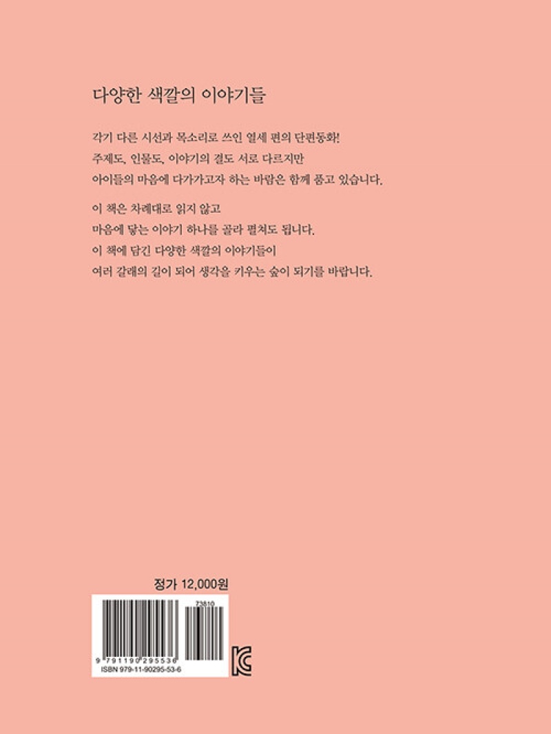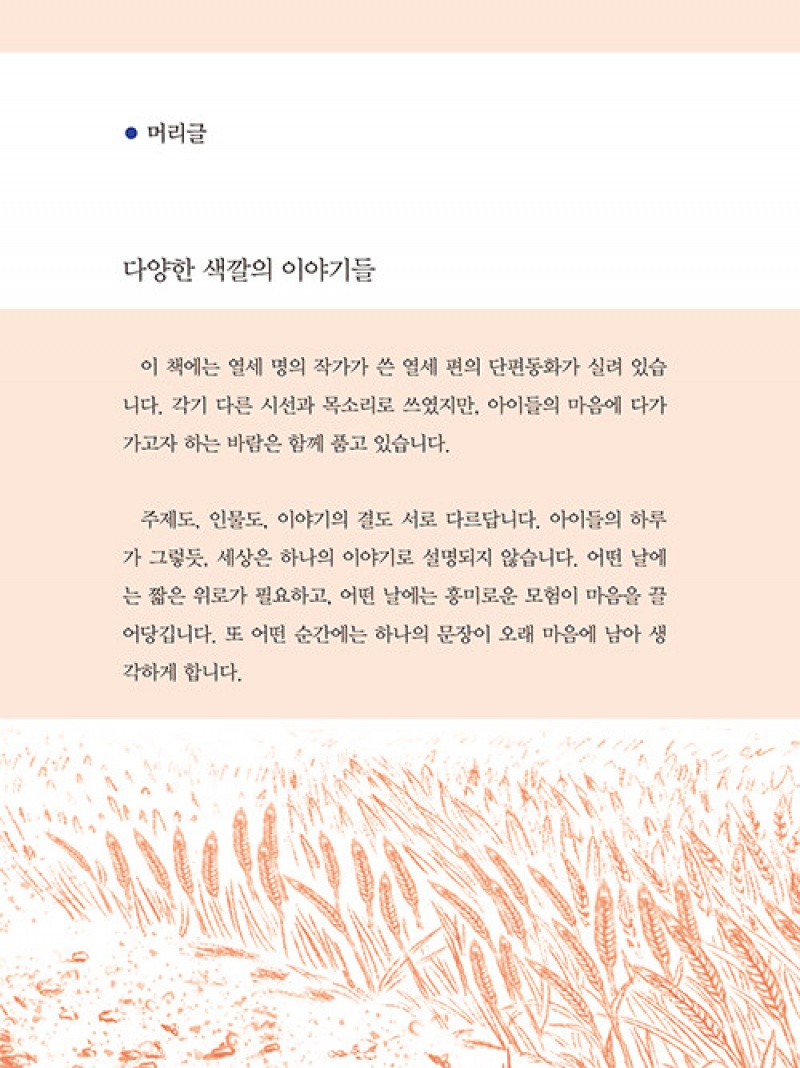 이 책에 담긴 다양한 색깔의 이야기들이 여러 갈래의 길이 되어 생각을 키우는 숲이 되기를 바라며, 각 단편에는 작가의 동화 창작에 대한 고뇌와 집필 방법을 기록하고 있어 예비 동화작가의 창작 활동에 많은 도움을 줄 것이다.-머리 글