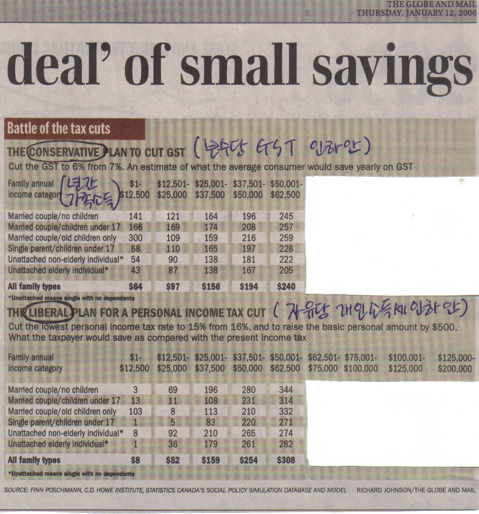 사실 스티븐 하퍼가 공약한 GST인하 방침은 자유당의 인컴택스 줄이는 방안보다 더 가난한 사람 들에게 유리 하다고 합니다.저소득층에게는 보수당 방안이 좀더 많은 혜택을 주며 고소득층에게 있어서는 엇 비슷 한것으로 나타납니다.