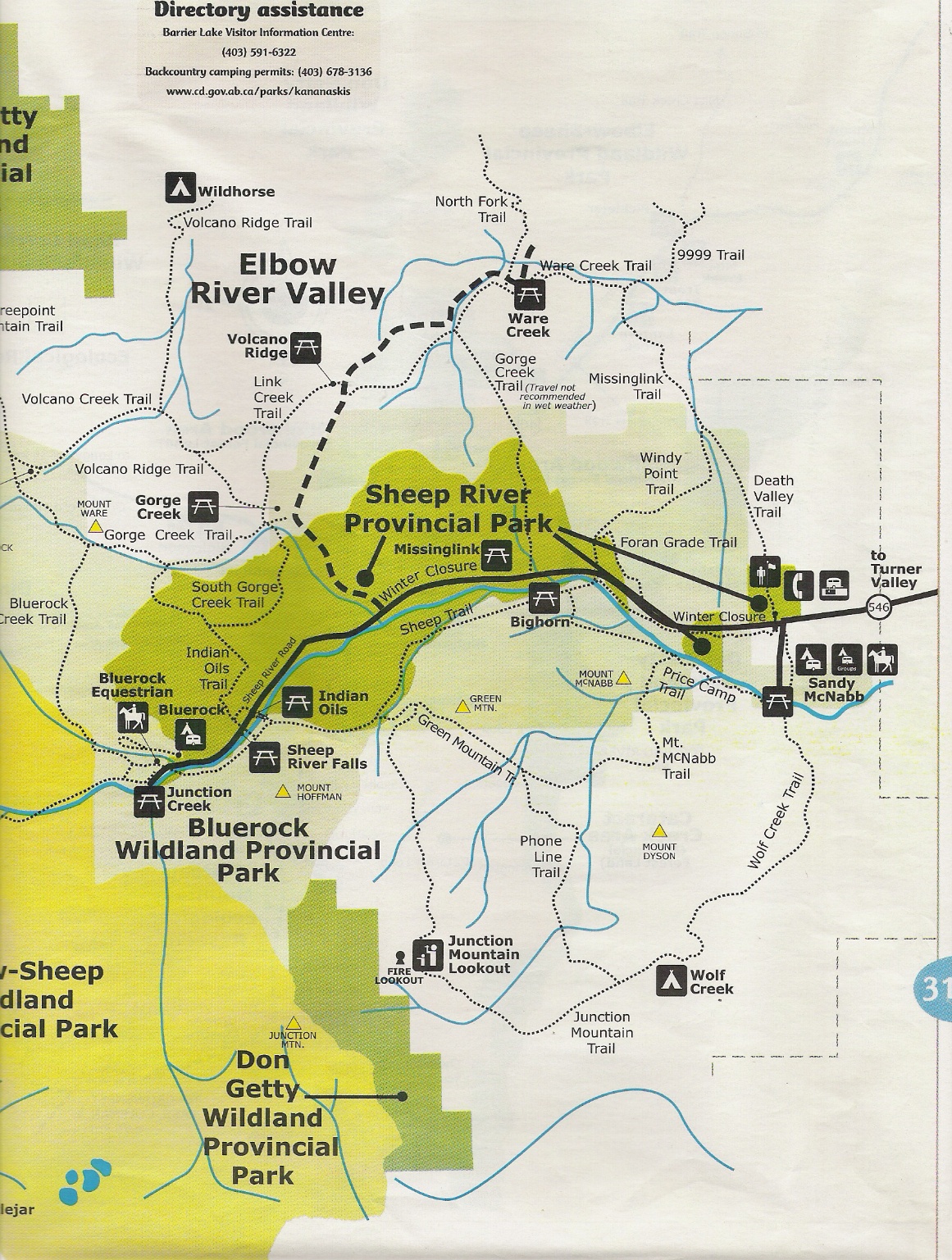 직진하시어 Bighorn, Indian Oils, Sheep River Falls, Junction Creek 등의 Day Use Area에 Parking하시거나 중간에 Gorge Creek Trail을 만나는 분기점에서 북으로 우회전 하시어 들어가시어 Geoge Creek Day Use 에 parking 하시고 근처 trail을 hiking하시면 됩니다. 첨부 지도에 점선으로 표시된 trail들 중에서 적당한 것을 택하시면 되고, 현지에 중간중간에 세워진 약도를 참고하시면 거리도 아실 수 있습니다. 운이 좋으시면 Bighorn sheep을 만나실 수 있을겁니다. 행운이 있으시길....