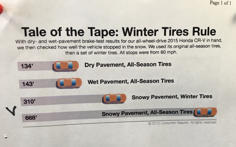 2015년 혼다 CRV를 가지고 테스트한 결과인데요 겨울철 눈이 내린 도로에서 사계절 타이어의 제동거리가 윈터타이어보다 2.2배나 더 긴 것으로 측정되었네요.