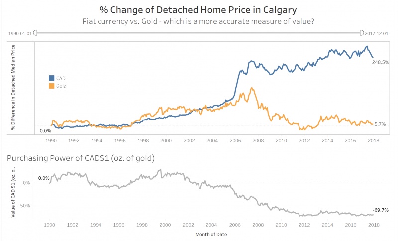 2007 년 6월을 시작점으로 분석을 해 보면 캘거리의 detached home 가격은 작년 12월까지 약 9.5년 동안 CAD로 봤을 때 3.8% 상승했고, 금으로 변환해 보면 55.7% 하락, 그리고 CAD$1의 구매력은 57.3% 하락한 것으로 나타납니다. https://public.tableau.com/shared/3HR87S77W?:display_count=yes