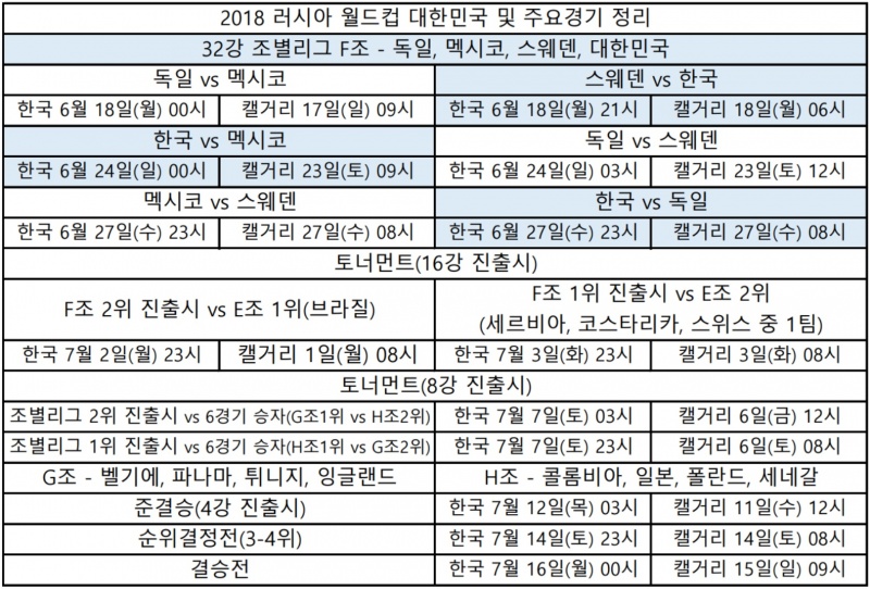축구를 좋아하는 사람인데, 아직 캘거리에 온 지 얼마 안된 친구들이 월드컵 일정과 캘거리 시간에 대해서 많은 혼동을 겪고 있어서, 이번 2018 러시아 월드컵 한국 경기와 주요 경기들 일정을 캘거리 시간으로 정리해 보았습니다.