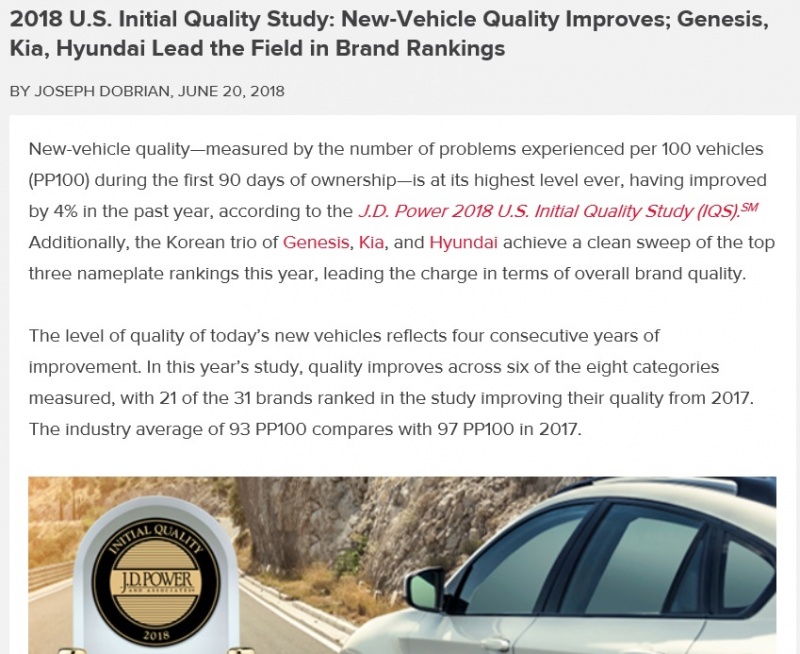 한국 자동차 메이커가 2018 IQS 전부 일등 했습니다.
