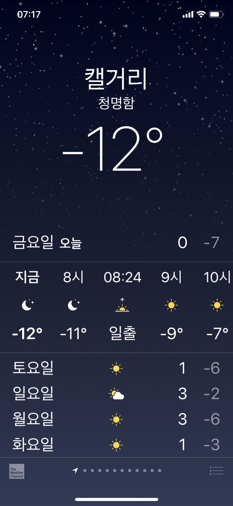 애플앱은 당일 기온이 최고 0 최저 -7로 표시되었구요