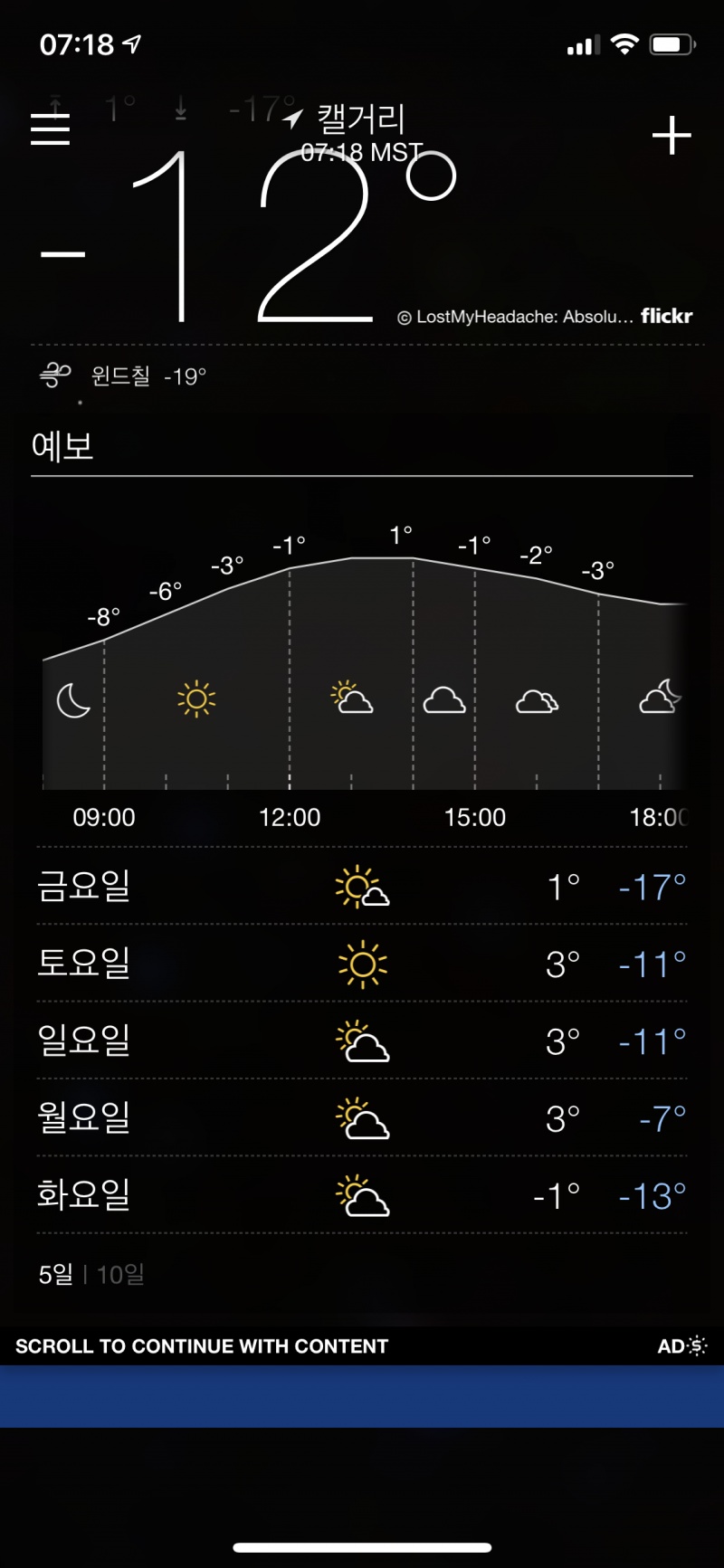 아이폰 전용 날씨 앱 수요일 -7 -15, 목요일 -2 -11 (첫번 사진)