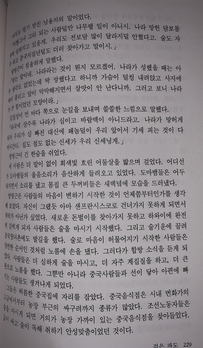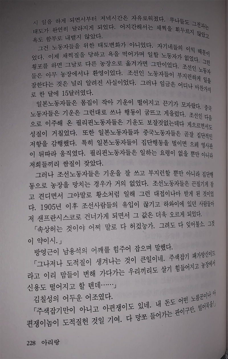 사진찍어 올리신 글 잘 봤습니다. 이 부분를 보니, 하와이에서 경험한 초기 조선인들의 경험을 잘 정리한 것 같습니다. 아마도 조정래님께서 당시의 후손들을 광범위하게 인터뷰했고 또 자료들을 많이 모은 것 같군요. 그래서 마치 당시 조선인들의 시선을 따라가는듯한 느낌을 받습니다. 미국 하와이라는 제 3의 나라에서 조선인들과 일본인들의 식민지인과 피식민지인의 관계가 연장되어 제 2의 차별을 경험한 이민선배들의 경험이 절절하군요. 위의 글을 보면 중국인과 일본인의 시선을 다시 조선인이 자신의 경험으로 내화한(internalized) 것도 잘 보여주는 것 같습니다.