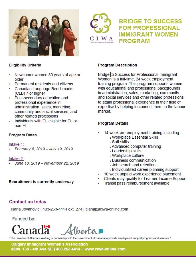 전문직 근무경험을 가지고 있지만 캐나다에서 원하는 직종의 일자리를 찾지 못하신 여성분들을 위한 고용 훈련 프로그램을 진행하고 있습니다.