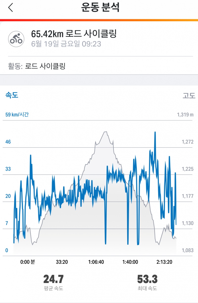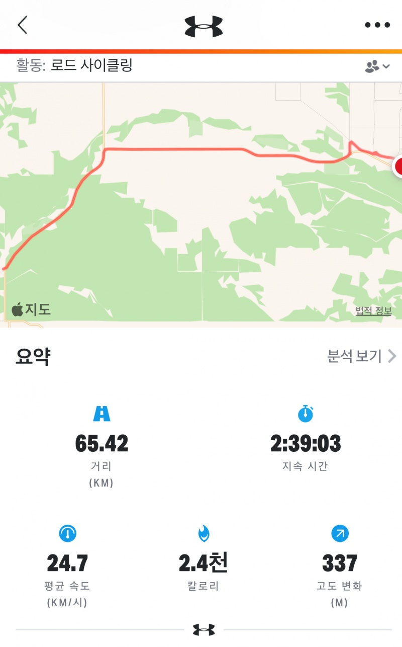 오고 가는 중에는 쉬지 않고 탔구요 총 거리 64.42에 평균 속도는 25km/H, 2400칼로리를 썼네요. 총 주행시간은 2시간 39분인데 갈때 1시간 29분 걸렸지만 올때는 1시간 10분만에 왔어요.