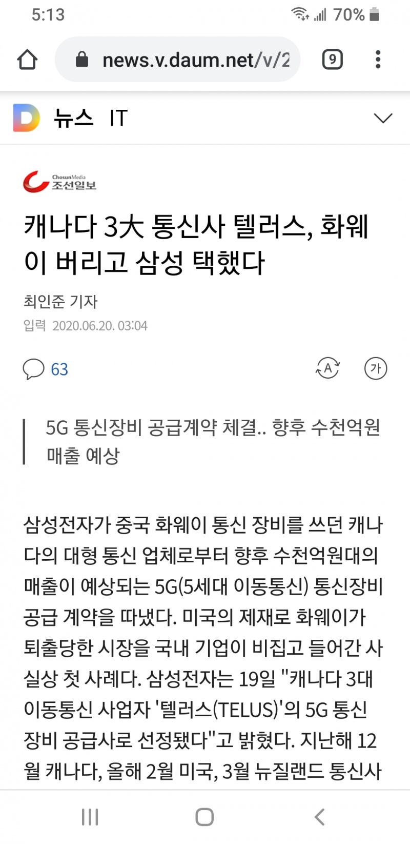 개인적으로는 삼성제품 안쓰지만 삼성이 텔러스와 통신장비 납품 계약 맺었다니 좋은 뉴스입니다.