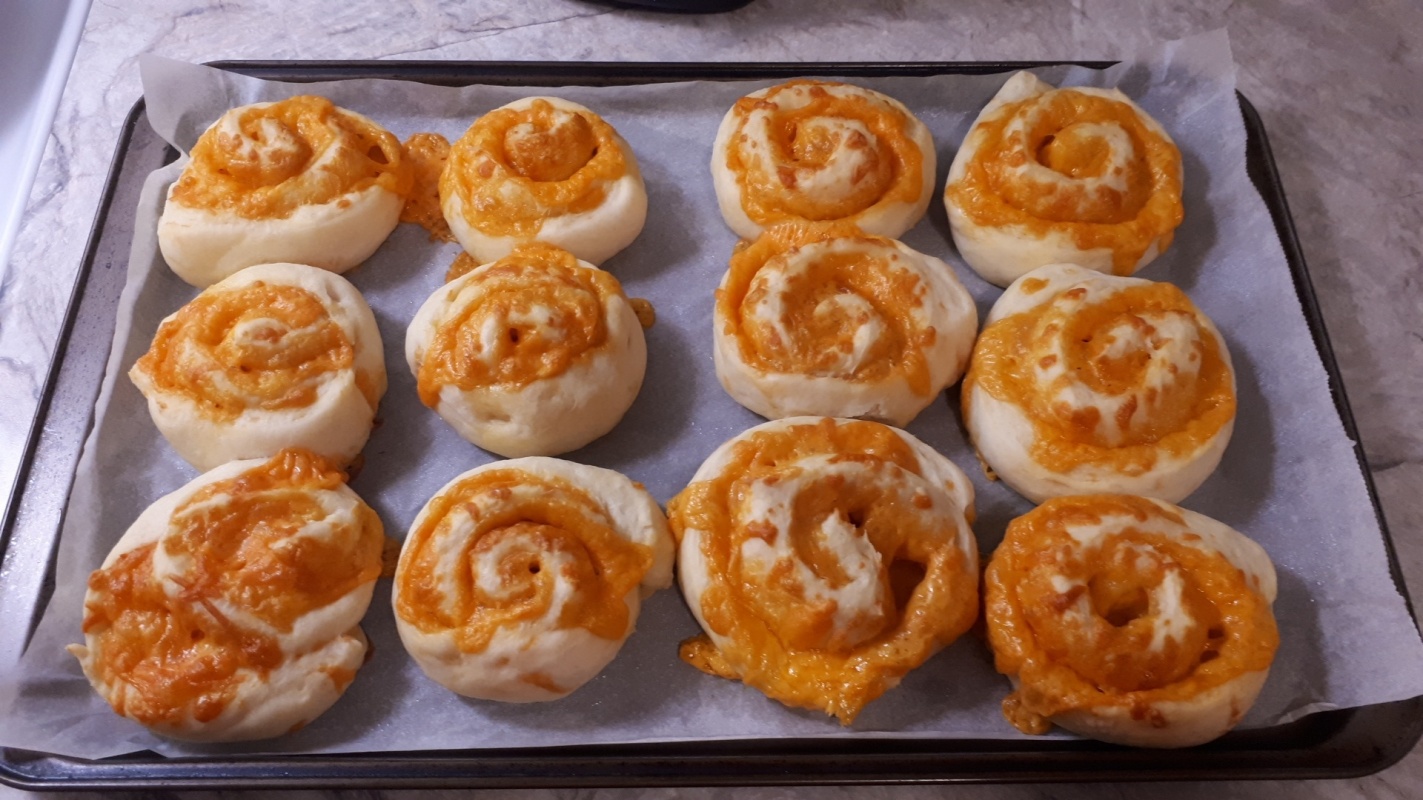 위에 집에서 만든 치즈번 사진 올립니다. - 사진에서 보기와는 다르게 속은 촉촉하고 치즈가 부드럽게 녹아들어 있습니다.