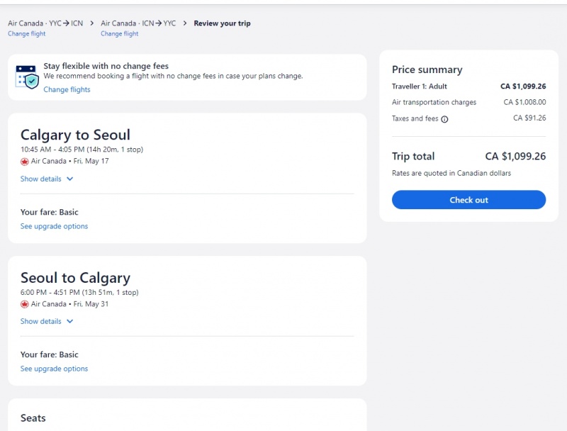 4/25~5/1일로 검색하면 나옵니다. 출발일이 하루만 차이가 나도 가격은 올라가며 이 날짜가 가장 저렴하네요. 정상적으로 올떄 갈때 모두 밴쿠버 경유이며 체류시간도 정상적입니다.
